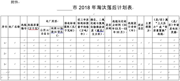 二、嚴格執行國家及我省制定的煤電淘汰落后標準,結合各市前期統計的“十三五”期間淘汰機組的摸底情況,對轄區內煤電機組進行嚴格篩查,根據篩查情況認真填報《 ? ?市2018年淘汰落后計劃表》,報送計劃中要說明列入淘汰計劃機組是否申請發電權獎勵。于2018年1月底前將本市2018年電力行業淘汰落后計劃以正式文件報省經信委。
