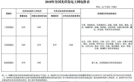 一、根據當前光伏產業技術進步和成本降低情況,降低2018年1月1日之后投運的光伏電站標桿上網電價,Ⅰ類、Ⅱ類、Ⅲ類資源區標桿上網電價分別調整為每千瓦時0.55元、0.65元、0.75元(含稅)。自2019年起,納入財政補貼年度規模管理的光伏發電項目全部按投運時間執行對應的標桿電價。