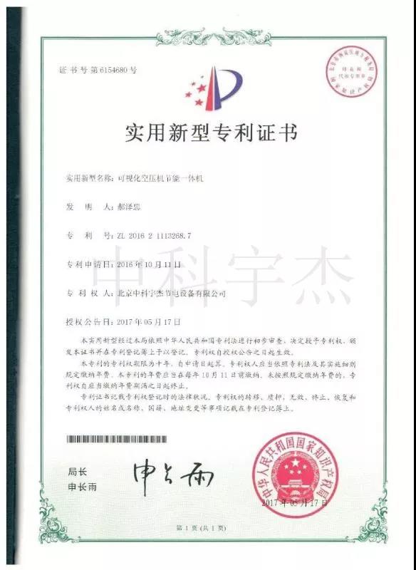 中科宇杰“可視化空壓機節能一體機”專利證書: