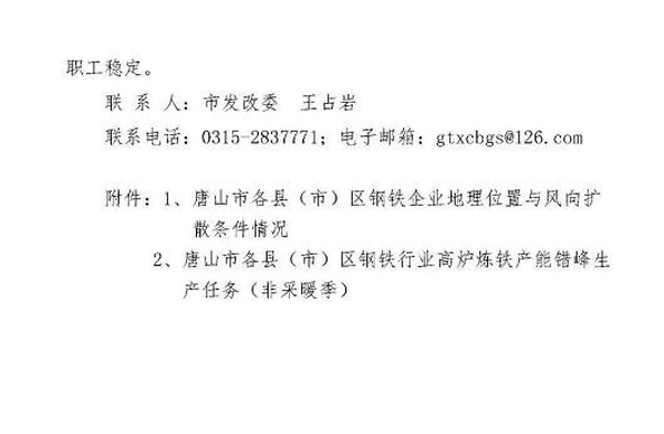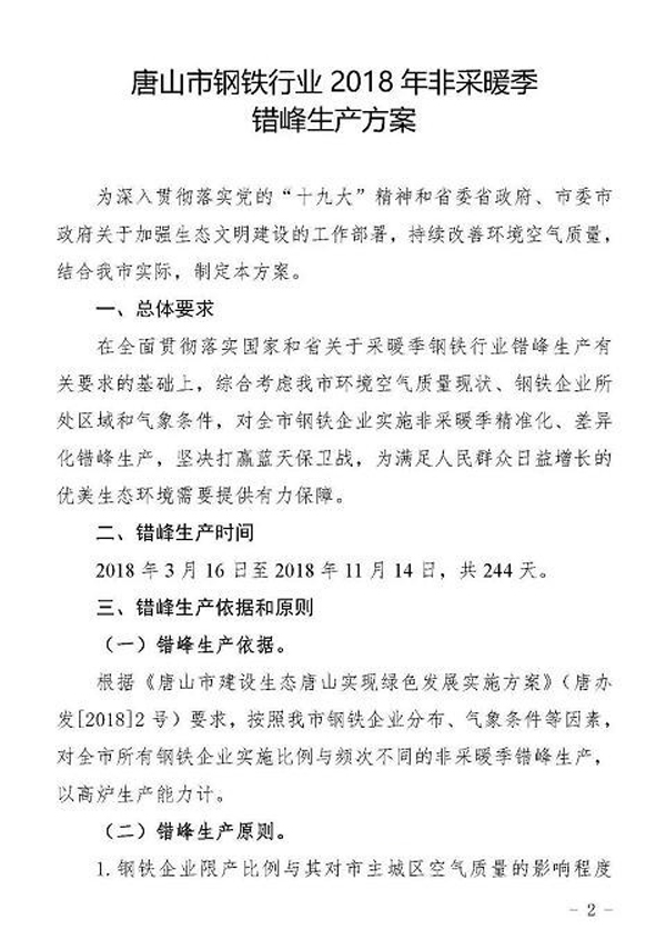 日前,《唐山市鋼鐵行業(yè)2018年非采暖季錯峰生產(chǎn)方案》經(jīng)市政府同意,已正式下發(fā)。方案中明確了錯峰生產(chǎn)依據(jù)和原則,綜合考慮唐山市環(huán)境空氣質(zhì)量現(xiàn)狀、鋼鐵企業(yè)所處區(qū)域和氣象條件,對全市鋼鐵企業(yè)實施非采暖季精準(zhǔn)化、差異化錯峰生產(chǎn)。全文如下: