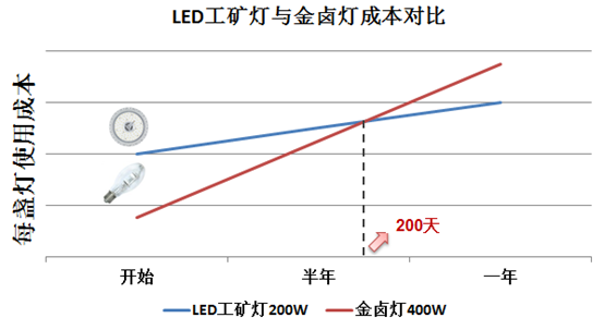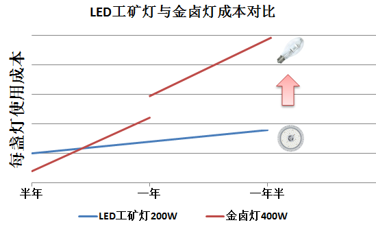 從短期看,金鹵燈的投入比LED工礦燈少。從長(zhǎng)期看,LED工礦燈是一種更環(huán)保、節(jié)能的綠色照明產(chǎn)品,而且不到1年的時(shí)間內(nèi)將收回全部投入。
